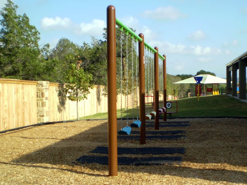 A very durable swing set. Galvanized steel 5" diameter posts and 3.5" diameter top rail. Available in red, blue, brown or green powder coating finish. It comes complete with chains and 6 strap seats. Fully enclosed bucket seats are available for an additional charge.